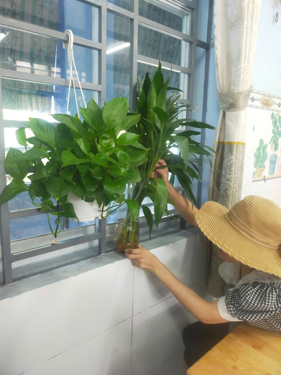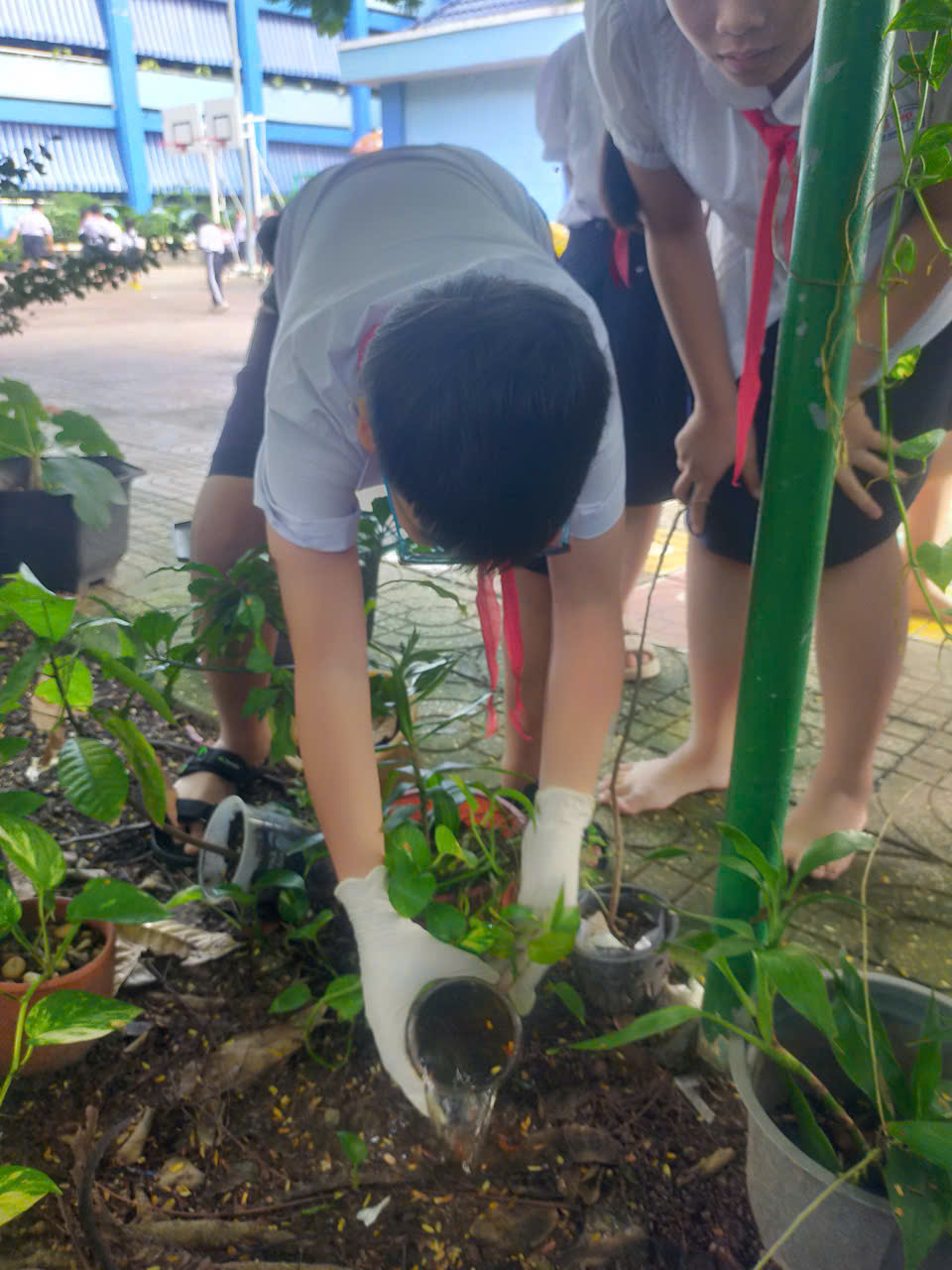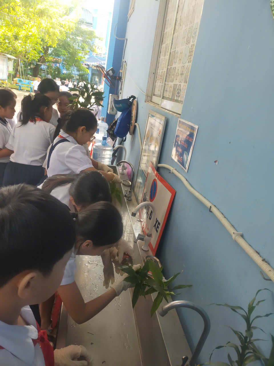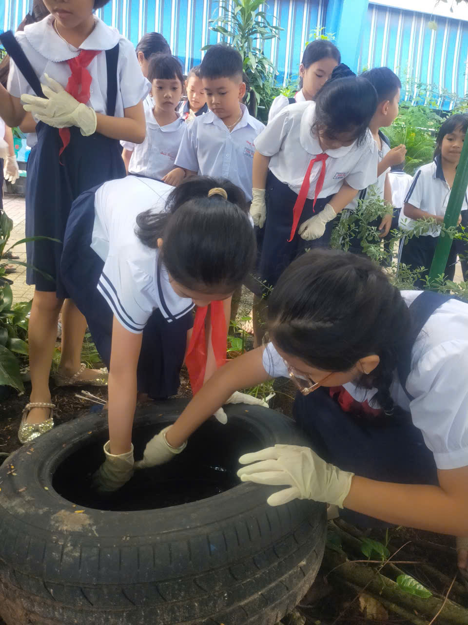 - Các biện pháp khác: Hun khói xua muỗi, diệt lăng quăng bằng cách nuôi cá bảy màu, ngủ mùng, dùng hóa chất ngăn cản muỗi đốt. Hiện vẫn chưa có thuốc chủng ngừa bệnh sốt xuất huyết. Do đó diệt lăng quăng , diệt muỗi là biện pháp ngăn chặn nguồn gây bệnh sốt xuất huyết tốt nhất. - Vì sức khỏe của mỗi gia đình và của cả cộng đồng. Tất cả mọi người hãy quan tâm thực hiện tốt các biện pháp phòng chống bệnh sốt xuất huyết với khẩu hiệu: “ Không có lăng quăng, không có muỗi vằn, không có sốt xuất huyết”./. Một số hình ảnh Cô y tế cùng các bạn học sinh dọn dẹp các vật dụng chứa đọng nước trong sân trường