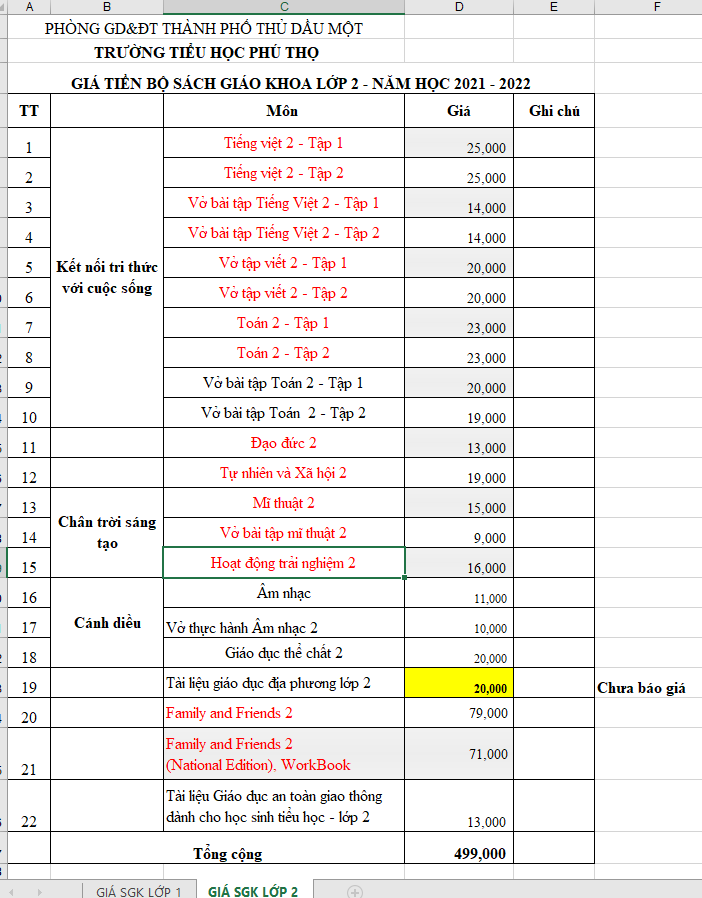 Báo giá SGK  lớp 2