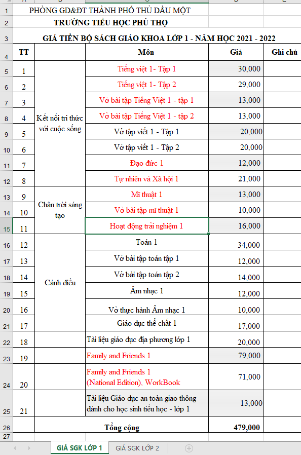 Báo giá SGK lớp 1