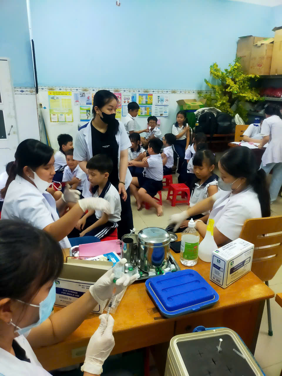 Buổi tiêm được thực hiện bởi 5 cán bộ y tế của Trạm Y tế phường, phối hợp chặt chẽ với nhân viên y tế trường, giáo viên và Ban Giám hiệu trường Tiểu học Phú Thọ.